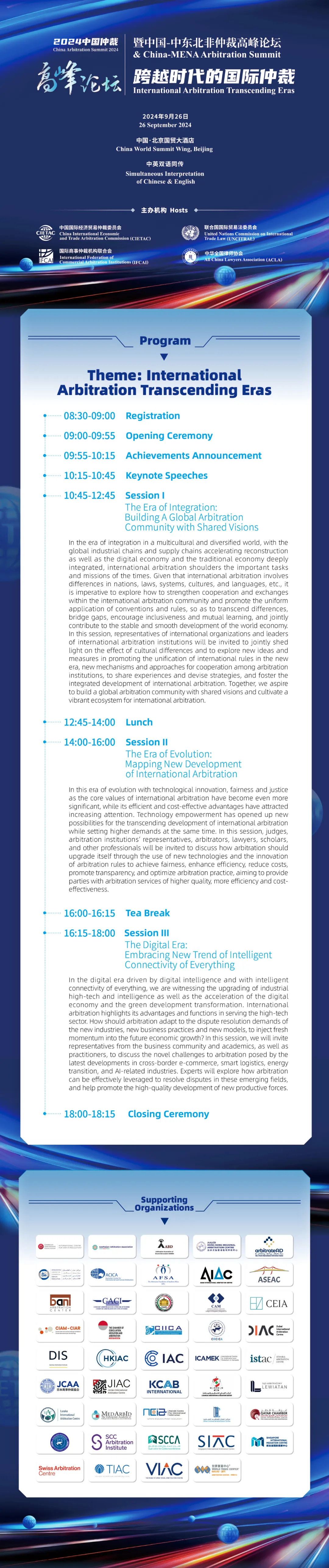 The China Arbitration Summit 2024 & China-MENA Arbitration Summit will be held on 26 September 2024 at China World Summit Wing, Beijing 爱丫爱丫影院. The Summit is co-hosted by China International Economic and Trade Arbitration Commission (CIETAC), United Nations Commission on International Trade Law (UNCITRAL), International Federation of Commercial Arbitration Institutions (IFCAI), and All China Lawyers Association (ACLA). .
